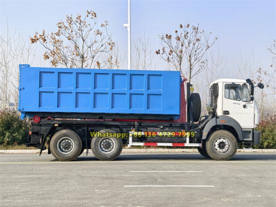 20-ton hooklift system, 20CBM garbage containerThe Beiben 20-ton Hooklift Garbage Truck is a specialized detachable container garbage collection and transport vehicle built on a Beiben heavy-duty chassis. Its core function is the rapid loading, unloading, and transport of standard waste containers via its hydraulic hook-arm system. The entire vehicle utilizes the reinforced Beiben 2642 chassis, powered by a 420 HP WP12 series diesel engine paired with a 12-speed manual transmission, providing robust power and high load-bearing capacity.