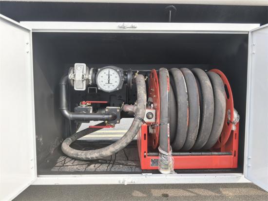 The Beiben 6×4 refueling truck integrates a modern refueling system, including two Censtar dispensers, each with a flow rate of 80 liters per minute, and a 15-meter retractable refueling hose. Safety features include European-standard manhole covers, API unloading valves, vapor recovery devices, and anti-overflow and anti-static systems, balancing operational efficiency with safety. The tank top is equipped with a walkway platform and ladder, along with professional accessories such as fuel pumps and piping boxes, making it suitable for various on-site refueling and distribution scenarios.