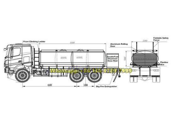 The Beiben 12000-liter refueling tanker is a professional mobile refueling equipment built on the Beiben 2638 heavy-duty chassis. It is powered by a 380-horsepower diesel engine paired with a 12-speed transmission. The tank is designed with a carbon steel compartmentalized structure, capable of transporting various types of fuel. The vehicle is equipped with two refueling dispensers, each with a flow rate of 80 liters per minute, along with bottom loading/unloading systems, vapor recovery units, and a full suite of safety devices, ensuring safe and efficient fuel transportation and on-site refueling operations.