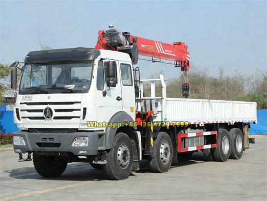 XCMG, palfinger/unic crane is optionalThe Beiben 8×4 truck-mounted crane is a multifunctional engineering vehicle that integrates lifting and transportation capabilities. It is built on a reinforced Beiben 12-wheeler chassis, powered by a 380-horsepower Weichai engine paired with a Fast 12-speed transmission, ensuring robust load-bearing and power performance. The vehicle is equipped with a Palfinger SPS25000 crane, which provides a maximum lifting capacity of 10 tons, a maximum working radius of 14 meters, and supports 360° full-revolution operation. Coupled with its 8-meter-long large cargo bed, it achieves efficient coordination between on-site lifting and logistics transportation.