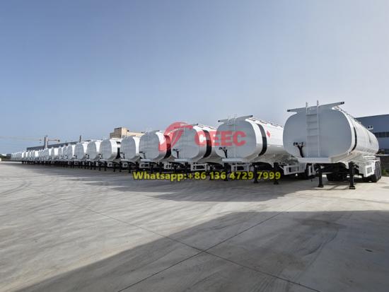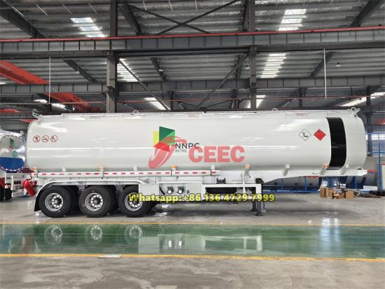 Stainless steel tank, aluminum alloy tank, BPM axles for optionNigeria NNPC fuel tanker semi-trailer is a specialized vehicle designed for transporting liquids such as fuel. This Nigeria NNPC 45,000-liter fuel tanker semi-trailer boasts a tank body constructed from Q235B carbon steel, divided into three independent 15,000-liter compartments capable of carrying different types of oil simultaneously. Each compartment is equipped with internal baffle plates to effectively suppress liquid sloshing during transit. The vehicle is fitted with robust components, including three 13-ton Fuwa axles, 12R22.5 tire sets, and a 28-ton JOST landing gear.
