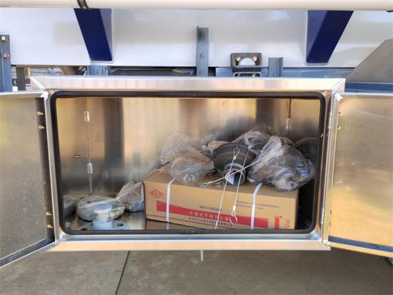Fuel tanker semi-trailers are essential equipment for liquid fuel transportation, playing a vital role in industries such as oilfields and gas stations due to their specialized design and excellent load-bearing capacity. This tri-axle 40000 liters oil tank semi-trailer has overall dimensions of 12,000mm × 2,500mm × 3,280mm and is equipped with 3 Fuwa 13-ton axles to ensure driving stability. The tank body is constructed from 5mm Q235 high-strength carbon steel and divided into 5 independent compartments, each with a capacity of 8,000 liters. Each compartment is internally fitted with baffles to enhance safety and prevent liquid sloshing. The tank is equipped with a European-standard 500mm manhole cover and breather valve, a 4-inch butterfly valve, and an aluminum pneumatic bottom valve. Combined with a 28-ton heavy-duty support leg and a WABCO braking system, the overall design balances practicality and reliability.